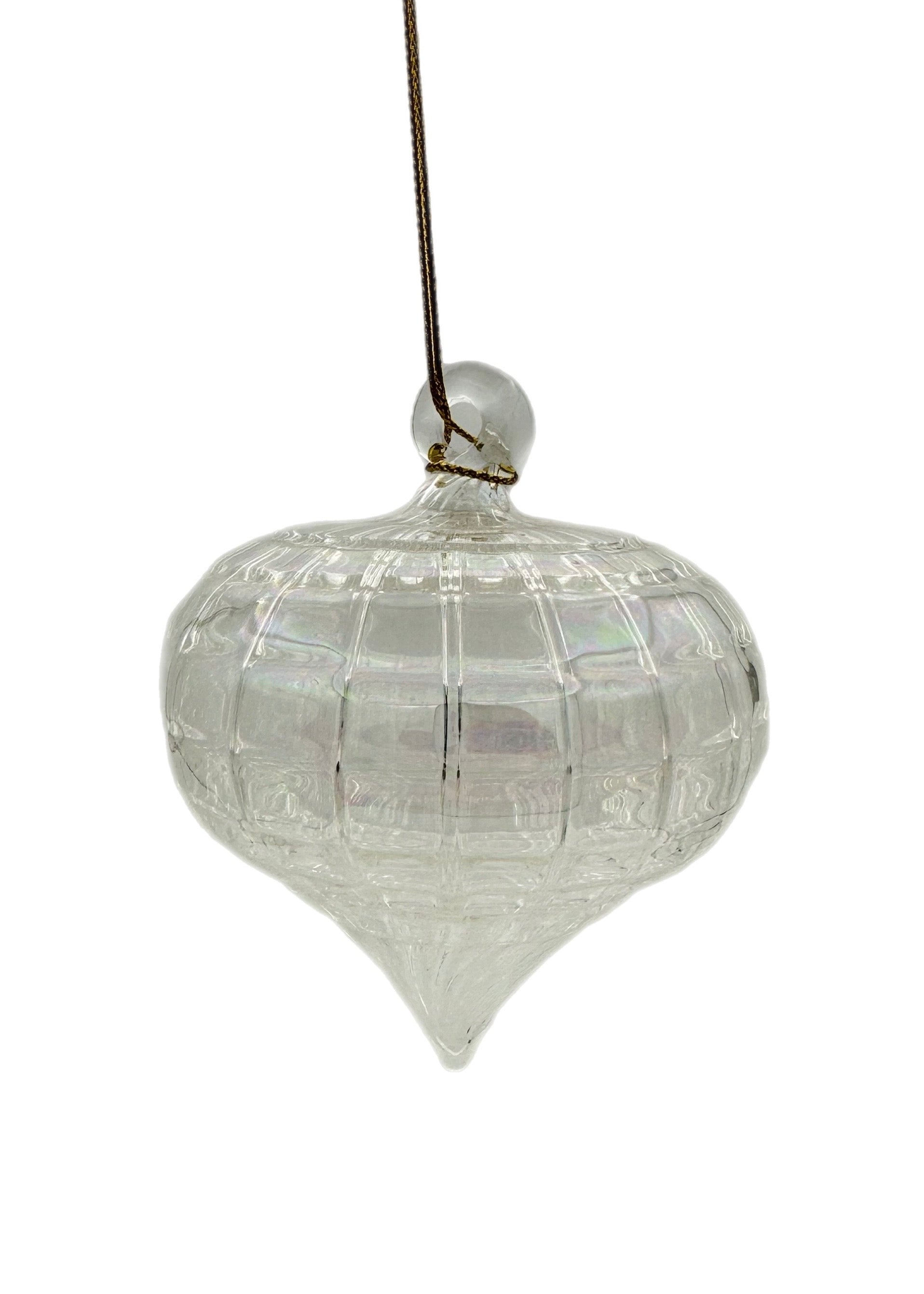 This handblown ornament features a gracefully fluted silhouette with a fine grid-textured surface, offering a subtle play of light and shadow — a timeless addition to any holiday collection.